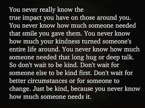 It usually does not take a lot to be kind. Sometimes I think we make it to hard, when something so simple and easy as a genuine smile can brighten someone’s day. Being polite and kind to others can sometimes be just what they need to make their day. Holding the door for someone, letting them go ahead of you in line, smiling and saying hello, being respectful, you never know how that may effect them for the better. The little everyday acts of kindness can be a seed planted in their lives that will grow and help them to be encouraged and to pass it on to others.