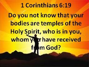 Or as it reads in 1 Corinthians 6:19 Or do you not know that your body is the temple of the Holy Spirit who is in you, whom you have from God, and you are not your own?